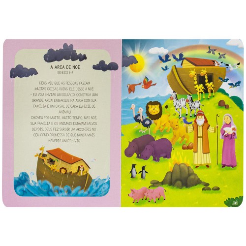 • Torna a leitura um momento de aconchego e amor entre pais e filhos. • Textos curtos e simples. • Estimula, desde cedo, o entendimento das palavras de Deus, a fé, as boas atitudes e a gratidão. • Uma ferramenta relevante para os Educadores cristãos. Esta obra, lindamente ilustrada, traz uma seleção de envolventes histórias da Bíblia. Da criação do mundo até a bonita e cativante história de Jesus e seus ensinamentos eternos.