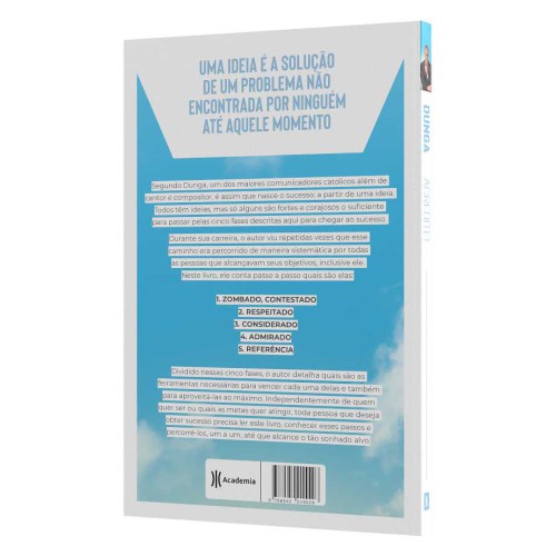 Saiba o que é necessário para ter sucesso Ideia é a solução de um problema não encontrada por ninguém até aquele momento. Segundo Dunga, um dos maiores comunicadores católicos, além de cantor e compositor, é assim que nasce o sucesso: a partir de uma ideia. Todos têm ideias, mas só alguns são fortes e corajosos o suficiente para passar pelas cinco fases descritas aqui para chegar ao sucesso. Durante sua carreira, o autor viu repetidas vezes que esse caminho era percorrido de maneira sistemática por todas as pessoas que alcançavam seus objetivos, inclusive ele. Neste livro, ele conta passo a passo quais são elas: 1. Zombado, contestado 2. Respeitado 3. Considerado 4. Admirado 5. Referência Dividido nestas cinco partes, o autor detalha quais são as ferramentas necessárias para vencer cada fase e também para aproveitá-las ao máximo. Independente de quem quer ser ou quais metas quer atingir, toda pessoa que deseja obter sucesso precisa ler esse livro, conhecer estes passos e percorrê-los, um a um, até que alcance o tão sonhado objetivo.