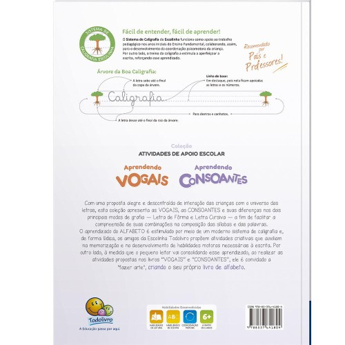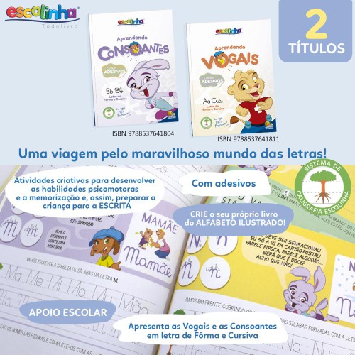 Com uma proposta alegre e descontraída de interação das crianças com o universo das letras, esta coleção apresenta as VOGAIS, as CONSOANTES e suas diferenças em seus dois principais modos de grafia - Letra de Forma e Letra Cursiva - a fim de facilitar a compreensão de suas combinações na composição das sílabas e das palavras. O aprendizado do ALFABETO é estimulado por meio de um moderno sistema de caligrafia e, de forma lúdica, os amigos da Escolinha Todolivro propõem atividades criativas, que auxiliam na memorização e no desenvolvimento de habilidades motoras necessárias à escrita. E, à medida que o pequeno leitor vai consolidando o aprendizado, ele é convidado a "fazer arte", criando o seu próprio livro do alfabeto.