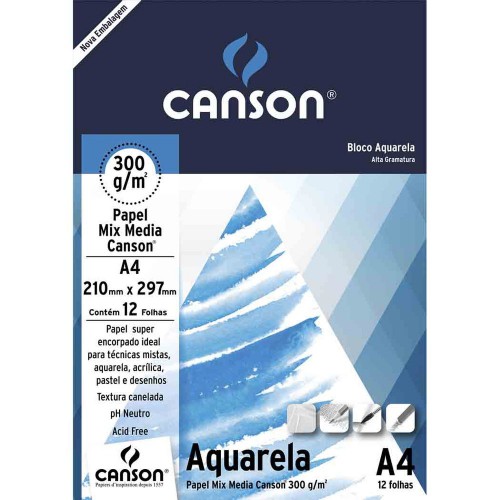 Bloco Aquarela A4 300g 12 Folhas - Canson Aquarela Mix Media , É Um Papel Artístico, Dupla-Face De Alta Gramatura E Com Dupla Face De Utilização Texturizada E Lisa. É Um Dos Papéis Artísticos Com A Melhor Relação Custo E Benefício Do Mercado, Além De Oferecer Um Ótimo Resultado Tem Um Alto Nível De Consevação . Especialmente Indicado Para Aquarela, Tinta Acrílica E Também Para Técnicas Secas Como Giz Pastel , Giz Oleoso E Lápis De Cor. Fabricado Na França. Fibra: 100% Fibras De Madeira. Brancura: Natural Sem Alvejante Ótico. Ph: Neutro, Ou Seja, Igual A 7 Para Evitar O Amarelamento. Textura: Delicadamente Canelada Para Realçar Os Efeitos De Luz Da Aquarela. Também Pode Ser Utilizada Para Desenho Com Giz Pastel E Tinta Acrílica. Cor: Branco.