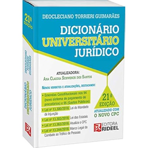 A Editora Rideel traz aos profissionais e acadêmicos de Direito a 21a edição do Dicionário Universitário Jurídico, com um conteúdo essencial, rigorosamente atualizado, associado a muitos mecanismos de busca desenvolvidos para agilizar e facilitar a pesquisa. Cada verbete foi criteriosamente elaborado para proporcionar a consulta de informações completas e coesas, que auxiliam na compreensão e melhoram o aprendizado no estudo do Direito. Mesmo os assuntos mais complexos e controversos são abordados de maneira clara e simplificada, tornando esta obra indicada para todos os interessados na área jurídica.