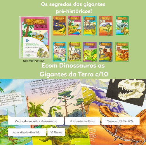 Eles dominaram a Terra por mais de 160 milhões de anos e foram os mais impressionantes répteis pré-históricos. Os dinossauros continuam sendo fascinantes, mesmo 65 milhões de anos depois de terem sido extintos. A Coleção ''''Dinossauros. Os gigantes da Terra'''' vem repleta de fatos que estão de acordo com os achados fósseis (paleontológicos) atualizados. Escrita de maneira simples e com ilustrações realistas, vai levar as suas crianças à época em que estes ''''lagartos terríveis'''' dominavam o mundo. Será uma viagem divertida e cheia de aprendizado sobre os primórdios da vida na Terra.