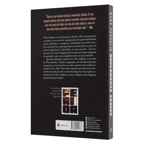 A aguardada continuação da série Segredos “Theo era um homem visceral, emocional, intenso. Eu me enganei quando achei que poderia esconder tudo para sempre, criar um conto de fadas em cima de tanta mentira, como se meu amor fosse suficiente para desculpar tudo.” – Eva Theo Falcão é um homem que desde cedo se acostumou ao poder e ao controle, assumindo as responsabilidades sobre a família e os negócios, dedicando sua vida a eles. Ao conhecer Eva, pela primeira vez descobriu o que era amar loucamente e, decidido, se casa com ela, sem saber que Eva tinha chegado ali movida por uma vingança do passado e por uma tragédia entre as suas famílias. Quando descobre quem Eva é de verdade, o mundo de Theo desaba. Traído e enganado, ele fará de tudo para recuperar o controle de sua vida e punir seus traidores, inclusive Eva. Mas Theo não esperava que ela tivesse desistido de tudo por ele e estivesse disposta a lutar por seu casamento. Poderá o amor redimir uma vingança perpetuada por anos?