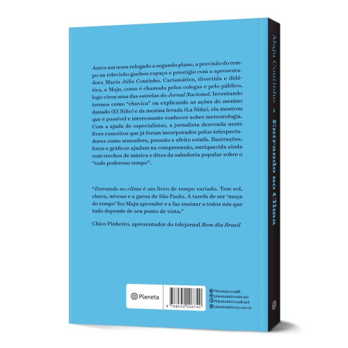 Antes um tema deixado em segundo plano, a previsão do tempo na televisão ganhou espaço e prestígio com a apresentadora Maria Júlia Coutinho. Carismática, divertida e didática, a Maju, como é chamada pelos colegas e pelo público, logo virou uma das estrelas do Jornal Nacional. Inventando termos como “chuvisca” ou explicando as ações do menino danado (El Niño) e da menina levada (La Niña), ela mostrou que é possível e interessante conhecer sobre meteorologia. Com a ajuda de especialistas, a jornalista desvenda neste livro conceitos que já foram incorporados pelos telespectadores, como atmosfera, pressão e efeito estufa. Ilustrações, fotos e gráficos ajudam na compreensão, enriquecida ainda com trechos de música e ditos da sabedoria popular sobre o “deus tempo”.