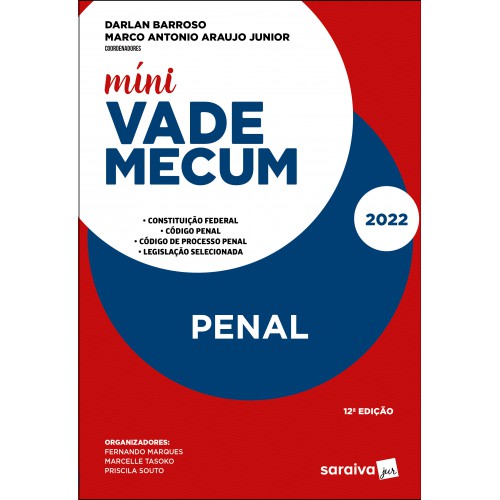 A obra Míni Vade Mecum Penal, chega à 12.ª edição, com seus maiores diferenciais:- Em conformidade com os principais editais de concursos, inclusive do Exame da OAB- Material preparado com orientação acadêmica e pedagógica de professores com larga experiência em Exame da OAB- Legislação com remissões estratégicas, sem jurisprudência ou doutrina (de acordo com o permitido pelo edital da OAB)- Súmulas, OJs e Precedentes Normativos (não comentados nem comparados)- Índices alfabético-remissivos, sem estrutura de peças processuais- Projeto gráfico diferenciado, com cabeçalhos que indicam as normas e os artigos- Papel que permite grifos ou marcaçõesO presente Míni Vade também se destina ao uso profissional, já que, na organização, incluímos a legislação atualizada e relevante no dia a dia do operador do Direito, bem como a jurisprudência sumulada de nossos Tribunais. Com certeza, seja para quem prestaExame de Ordem ou Concurso Público, ou ainda para atuação profissional, essematerial é o mais completo e atualizado. Destaques: Código PenalCoação no curso do processo LeiMariana Ferrer (Lei n. 14.245, de 22-11-2021)Crimes contra o Estado Democrático deDireito (Lei n. 14.197, de 1.º-9-2021) Código de Processo PenalAudiência de instrução e julgamento Lei Mariana Ferrer (Lei n. 14.245, de 22-11-2021) Atualizações na Lei de improbidadeadministrativa. (Lei n. 14.230, de 25-10-2021)Normas para prevenir, reprimir e combater a violência política contra a mulher (Lei n. 14.192, de 4-8-2021)Programa de cooperação Sinal Vermelho contra a Violência Doméstica (Lei n. 14.188, de 28-7-2021)