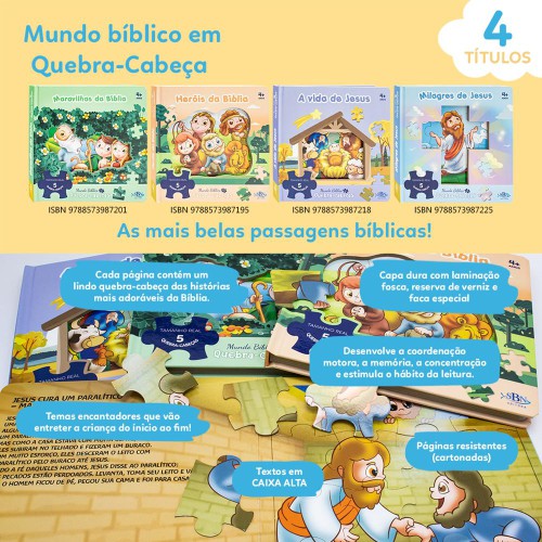 Com delicadas ilustrações e texto adequado ao universo infantil, a coleção ''''Mundo Bíblico em quebra-cabeça'''' foi criada com a finalidade de apresentar de forma lúdica as mais conhecidas passagens bíblicas. Excelente maneira de introduzir na realidade da criança os ensinamentos fundamentais do cristianismo visando despertar o interesse e afeição dos pequeninos pelas Sagradas Escrituras. Complementando cada página, cinco quebra-cabeças vão ainda entreter e desenvolver memória e coordenação motora simultaneamente. Abra seu livro e divirta-se com coloridos quebra-cabeças para montar.