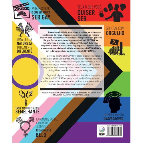 Repleto de citações memoráveis e infográficos que desmistificam crenças e dogmas, o livro traz à luz histórias muitas vezes esquecidas e ocultas, além de ideias e eventos essenciais na trajetória e na cultura LGBTQIAPN+, como a Revolta de Stonewall, em Nova York; a criação do primeiro jornal gay do Brasil, em 1978, e a linguagem secreta pajubá, adotada pela comunidade trans no Brasil durante a ditadura militar e que hoje virou símbolo de representatividade.