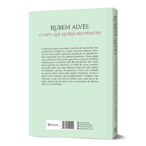 O sapo que queria ser príncipe é um livro de memórias. Isso poderia ser verdade se o autor não fosse Rubem Alves. Em sua obra, nada é assim tão simples de ser classificado. Suas memórias não são apenas memórias. Nestas páginas, as histórias do menino que deixa o interior de Minas Gerais para se aventurar pelo Rio de Janeiro são verdadeiras pérolas de sabedoria. O estilo do autor transforma cada relato em uma deliciosa lição de vida repleta de filosofia e poesia. Terminamos o livro com vontade de querer saber como tudo aquilo continuou. Como o pastor virou escritor, não abandonando a religião, mas trazendo o que ela tem de melhor para mais perto de todos através da literatura. Ler as memórias de Rubem Alves é um privilégio. Idade Mínima Recomendada: 10 Anos