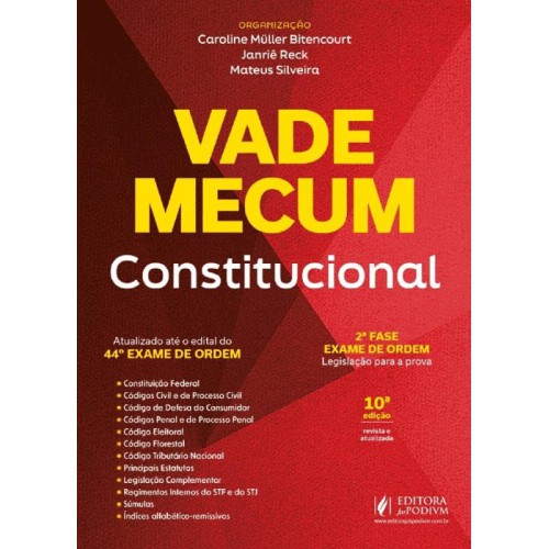 O Vade Mecum Constitucional foi criado especialmente para atender às necessidades dos candidatos ao Exame de Ordem que fizeram a opção pela área Constitucional na 2ª fase do certame. A obra é organizada pelos experientes e renomados Professores Caroline Müller Bitencourt, Janriê Rodrigues Reck e Mateus Silveira, que fizeram a seleção das normas, elaboraram as remissões e os índices alfabético-remissivos. O Vade traz os principais diplomas legais objeto de questionamento na 2ª Fase do Exame da OAB e conta com diversos facilitadores de consulta como tarjas laterais com as seções do livro, cabeçalho, atualizações legislativas destacadas, dentre outros. Esse Vade está atualizado até o edital do Exame 44º da OAB e a sua consulta é permitida na 2ª fase, tornando-se um aliado fundamental durante a realização da prova para buscar as fundamentações e os argumentos jurídicos necessários para a aprovação.